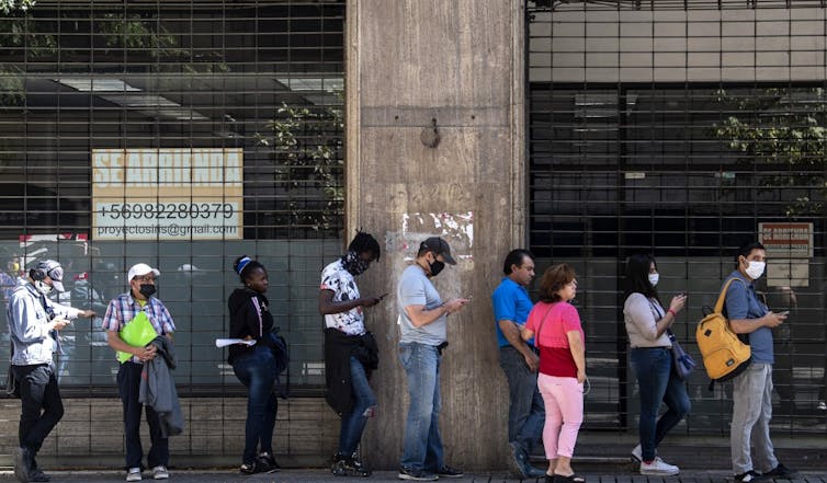 Des personnes portant des masques faciaux font la queue pour recevoir leurs indemnités chômage devant le siège de la Société d’administration des fonds de chômage à Santiago, le 6 avril 2020. Martin Bernetti/AFP