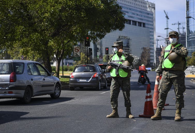 Des militaires contrôlent un carrefour à Santiago, le 30 mars 2020. Martin Bernetti/AFP