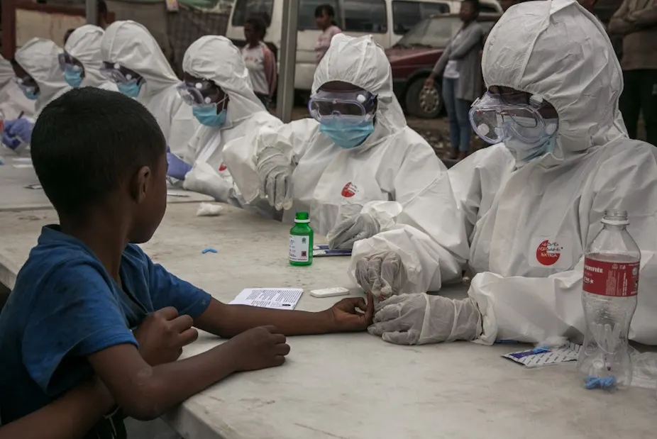 Des agents de santé prélèvent des échantillons de sang sur un enfant pour détecter le covid-19, à Antananarivo le 3 avril 2020. Les autorités sanitaires malgaches ont décidé de procéder à des « tests de diagnostic rapide » pour le COVID-19 et de désinfecter les rues des quartiers où des cas d’infection ont été constatés