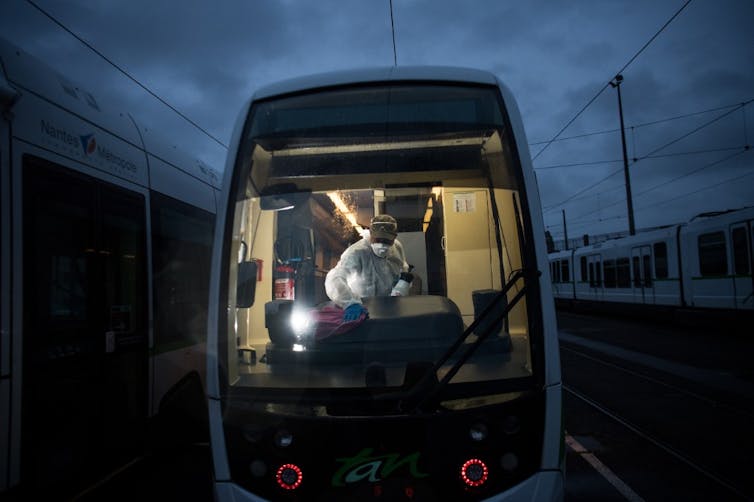 Un employé d’une entreprise de propreté nettoie un tramway en fin de journée à Nantes, le 29 avril 2020. Loïc Venance/AFP