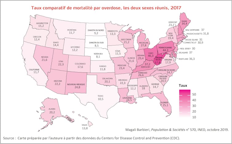 Cette évolution est indépendante du niveau initial de la mortalité. L’augmentation rapide de la mortalité par overdose concerne tant des États qui figuraient plutôt en tête du classement pour l’espérance de vie à la naissance, comme le New Hampshire, que des États situés en bas du classement, comme la Virginie occidentale, qui se caractérise par le taux le plus élevé de mortalité par overdose.