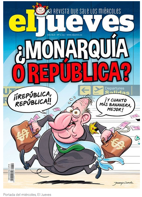 Le satirique El Jueves (autrement dit “Le Jeudi” qui tout “logiquement” sort le mercredi) fait sa couverture sur l’ex Roi fuyard… En chapeau la question à cent (?!???) euros : “Monarchie ou République ?” qui commence à tarauder de plus en plus les esprits outre-Pyrénées bien au-delà d’une Catalogne qui a déjà depuis longtemps sa réponse (1).
