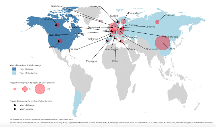 Ces éléments permettent de mieux comprendre comment des élevages de visons auraient pu servir d’intermédiaire entre la chauve-souris et l’homme dans le cas du SARS-CoV-2. Ce phénomène a été observé dans le cas de la grippe aviaire, avec l’introduction du virus par le biais de contact avec les réservoirs sauvages (palmipèdes) asymptomatiques puis l’amplification de la maladie dans les élevages intensifs à forte densité, et la production au final de souches virales mutantes virulentes pour les animaux sauvages réservoirs initiaux.